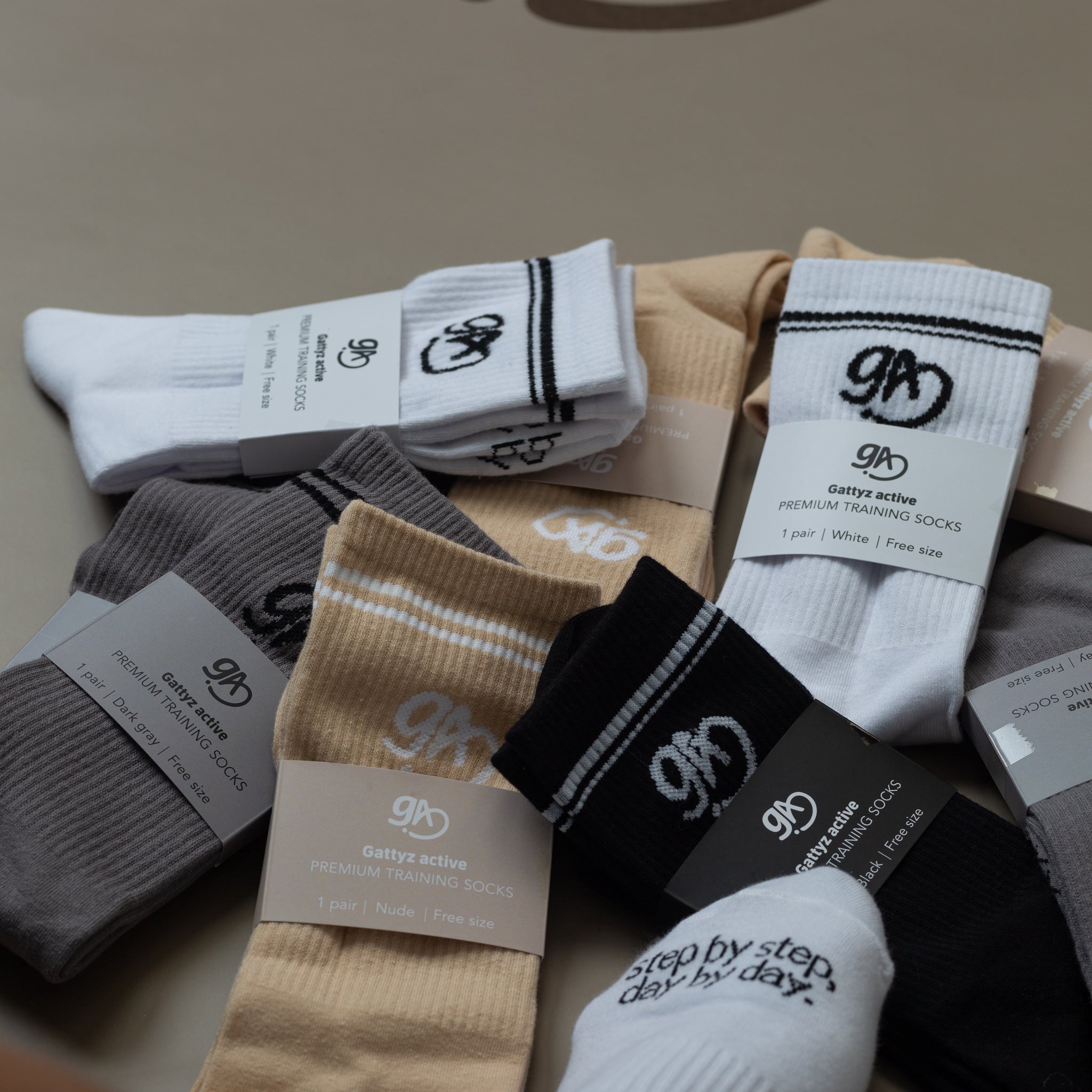 Gattyzactive premium training socks are crafted with the perfect blend of cotton and polyester to keep your feet feeling soft,dry and smooth through the day. Our jacquard mid-calf socks are breathable and comfortable providing you with outmost support while training.Detailed with a little motivational quote “Day by Day, Step by Step” around the foot, our logo-type and double border lines at the cuff for a stylish edge.