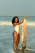 Romantic, feminine, and effortlessly captivating. Designed to embody the glow of golden-hour waves and soft pastel skies, Peony one-piece pairs a delicate butter-cream base with blush pink contrast trims, creating a subtle yet striking contrast that feels both playful and elegance with sculpting details for a swim look that’s equally at home in the surf or styled out.