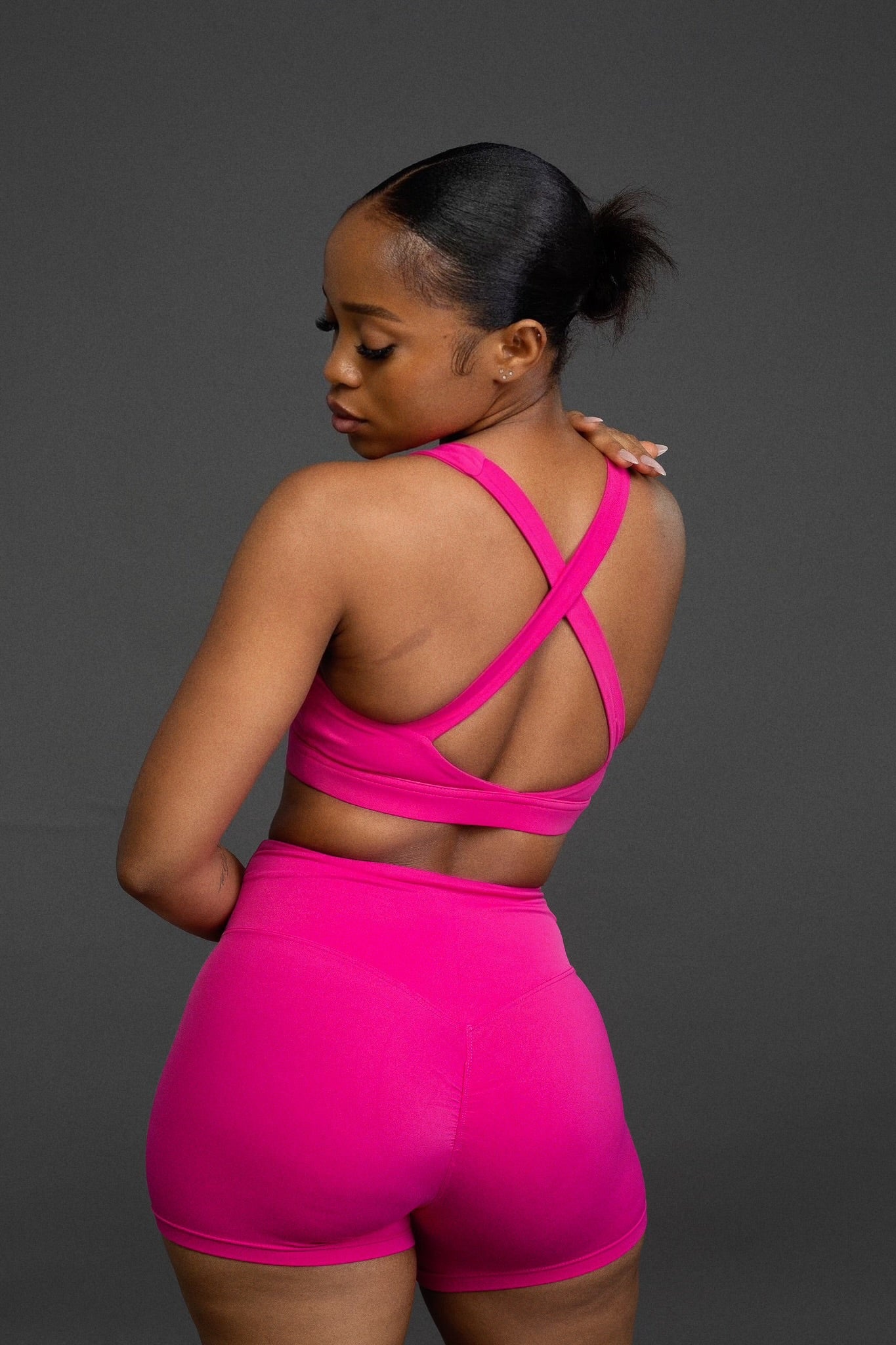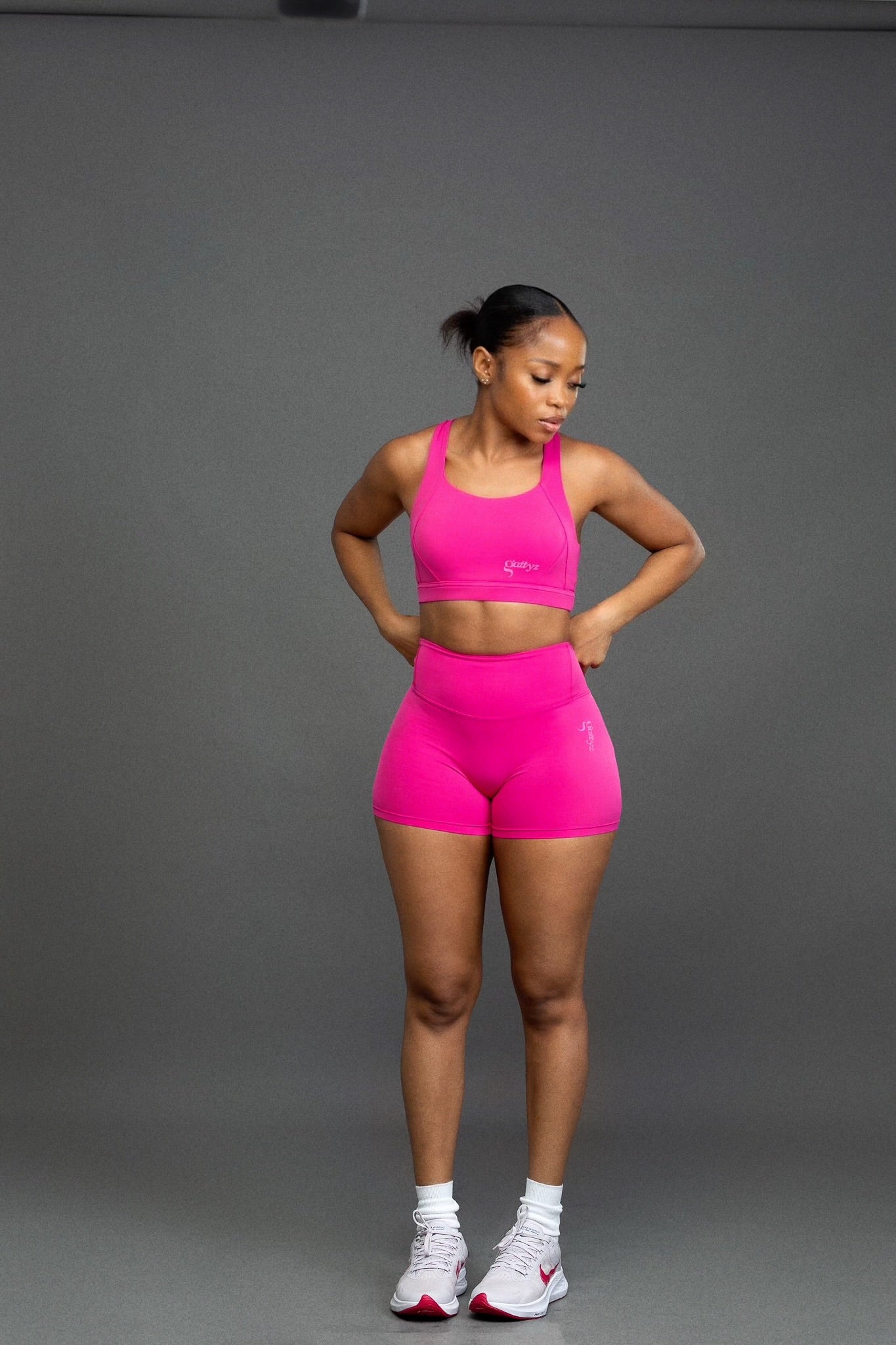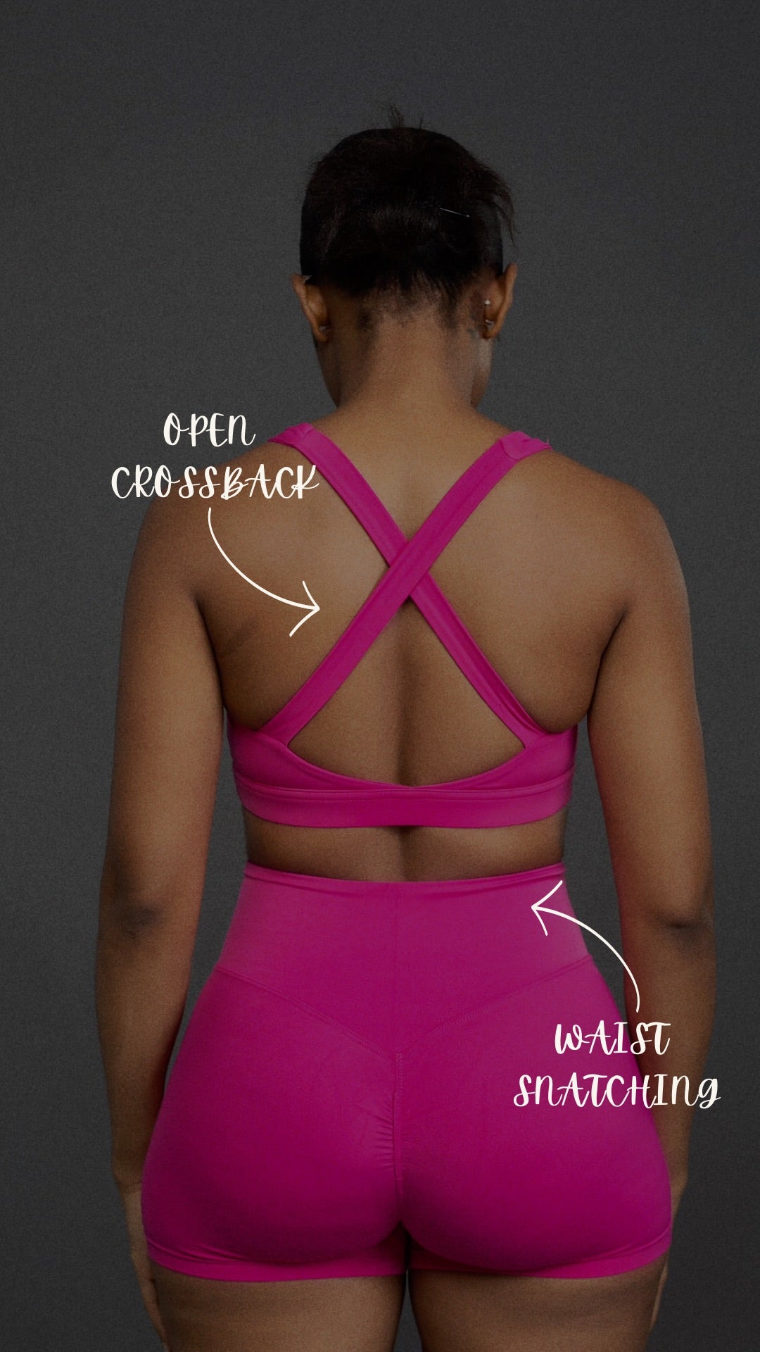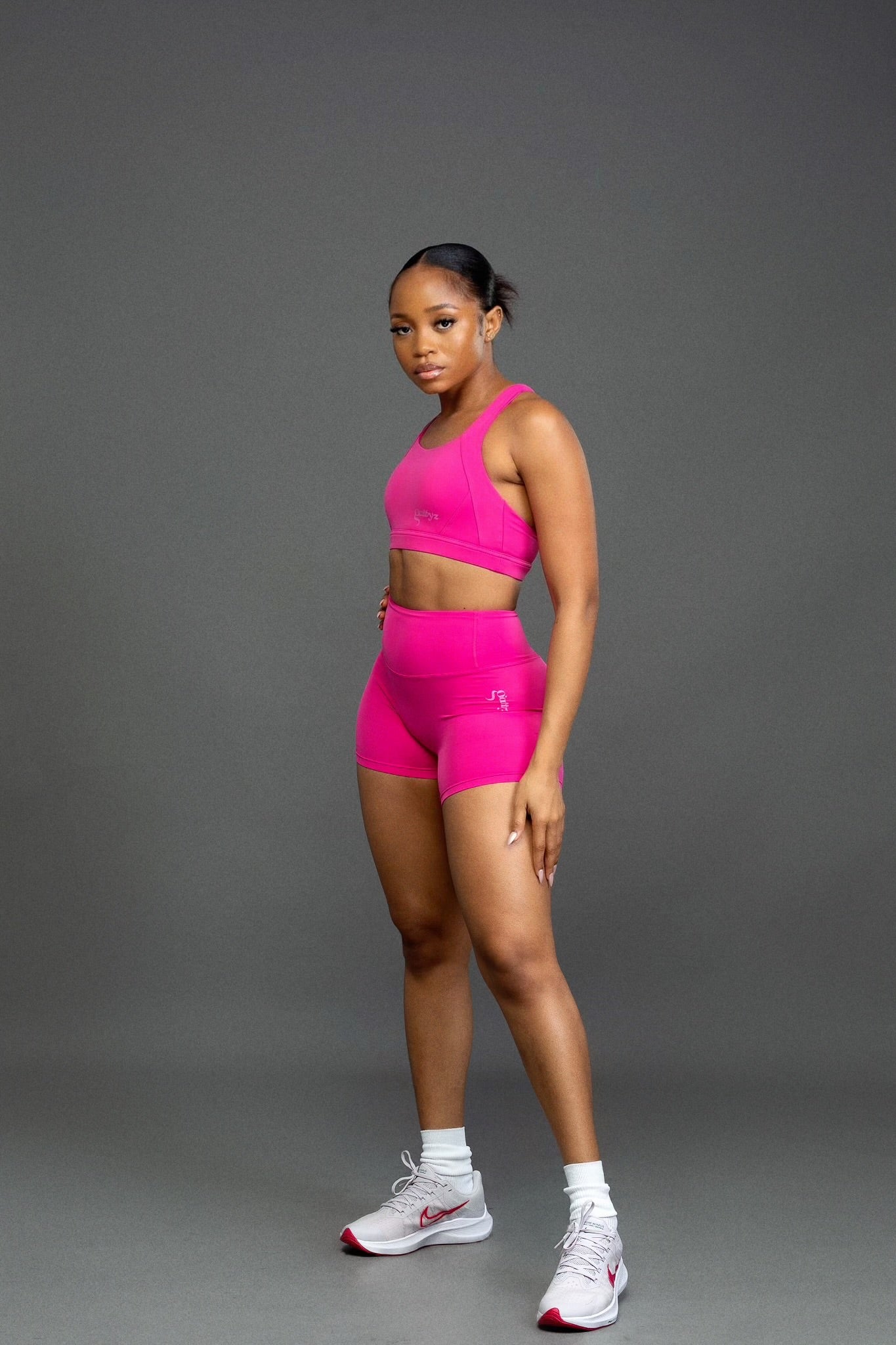 The Peart set provides the perfect level of modern simplicity to your wardrobe and workout fits. The high-waisted shorts enhances the shape of your waist and tones the lower abdomen. On the backside, the light scrunch detailing creates an elegant lift to the glutes. The Scoop X bra features an Ultra-flattering scoop neckline and the sexiest straps down the back, sleek and form-fitting. It comes in a stunning pink colour perfect for an active lifestyle.