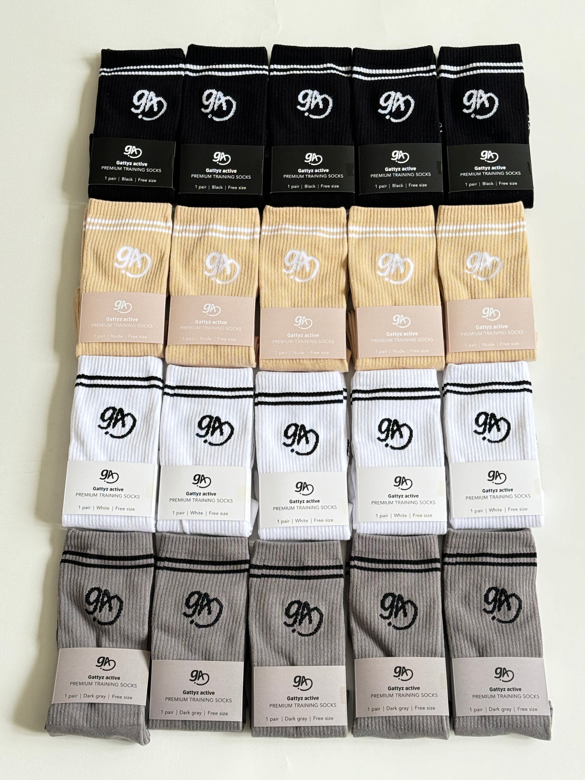 Gattyzactive premium training socks are crafted with the perfect blend of cotton and polyester to keep your feet feeling soft,dry and smooth through the day. Our jacquard mid-calf socks are breathable and comfortable providing you with outmost support while training.Detailed with a little motivational quote “Day by Day, Step by Step” around the foot, our logo-type and double border lines at the cuff for a stylish edge.