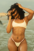 Romantic, feminine, and effortlessly captivating. The Peony Bikini is designed to embody the glow of golden-hour waves and soft pastel skies. This two-piece set pairs a delicate butter-cream base with blush pink braided straps, creating a subtle yet striking contrast that feels both playful and elegant.