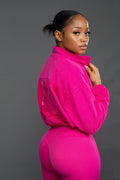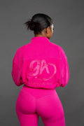 The Peart full zipper Jacket features an adjustable drawstring and elastic hems around the waist and at the wrists and this style can be worn Zipped up or down. Casual and functional with a generous fit to the body and arms. This cozy jacket is Perfect for layering over our peart set. This jacket is soft, lightweight, and comfortable. It comes in Lilac and Pink with our logo embroidered on the back as a perfect touch of elegance.